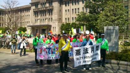 4月18日(土),市役所前に集合して,人権啓発パレードが盛大に行われました。前肢のPTAが一堂に会して,市役所前を出発して,河原町通りを四条まで南下しました。