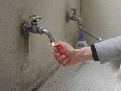 学校薬剤師の柴原先生に皆さんが飲んでいる水が衛生的かどうか検査していただきました。水道の蛇口を滅菌し(ライターであぶってられました)水を取って検体ビンに採取されてました。