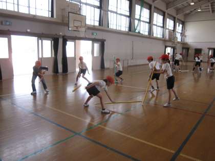 後半は,同じグループになったメンバーで協力し,棒を使った運動をしました。