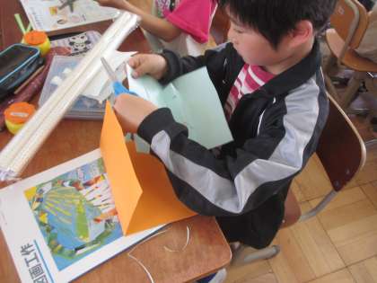 図工の時間の様子です。今回は「とびだすメッセージカード」を作っています。飛び出すカードのつくりかたは、2年生のときに国語の教材で学習しました。4年生になった今は、2年生のころ比べてぐぅ〜んと成長しているので、アイディアもどんどん出てきます。