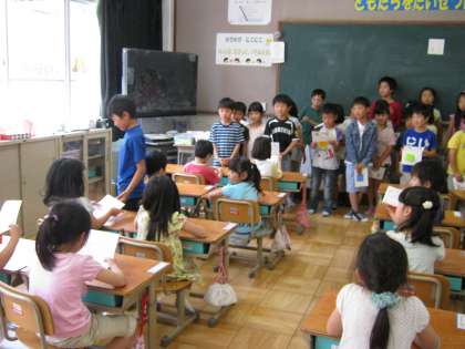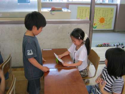 先日,2年生のお兄さんお姉さんが教室に来て,学校探検の招待状をわたしてくれました。とても楽しみですね。アサガオの種のプレゼントもついていました。1年生はお家に帰ってぜひ育ててみてくださいね。