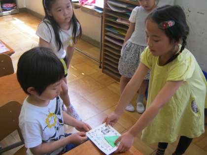 1年生の教室にプレゼントのアサガオの種と招待状を持って行きました。今度の木曜日を楽しみにしておいてくださいね。
