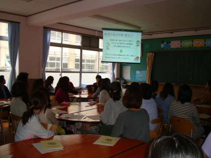 教頭先生,PTA会長の山本さんのあいさつの後,「たのしい,おいしい学校給食」と題して,学校給食の歴史や献立ができるまでのこと,献立を考える条件や,子どもたちの給食の様子などのお話をしました。