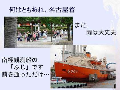さあ,風はかなり強かったのですが,雨はまだセーフ。水族館へ直行しました。通り道に,南極観測船の「ふじ」が停泊していました。もちろん,現在は引退して,博物館的な役割をしているようです。「ふじ」を横目に水族館へ。
