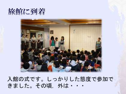 強い雨の中,ひたすら旅館へ。入館式の様子です。いくら強い雨でも,屋内に入ればこっちのものです。この後は,外に出ることがないのですからね。