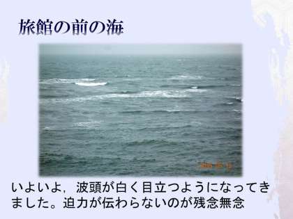 外の海は,ずいぶん波がうねってきました。白波が目立ちます。海の向こうの景色は一切見えず,灰色一色です。