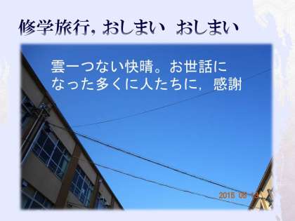 引率の先生たちや,写真屋さんのTさん,旅行代理店のTさん,またお迎えに来て下さった皆さんに,心より感謝申し上げます。