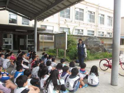北警察署や交通安全見守り隊、PTAのお母さんたちなど、たくさんの方々に指導していただきました。この時間までに、自転車についてのDVDも見て、事前に学習もしているそうです。