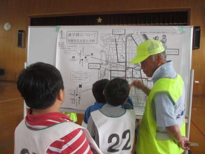 体育館の中では、地域の地図を広げて、どこが危険なのかシールを貼って確認をしていました。やはり、大きな交差点はどの子も注意をしているようです。また、坂道や曲り道などにシールを貼る子もいました。