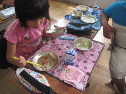 今日の給食は大人気メニューの1つ、チキンカツでした。自転車教室が終わっておなかをすかせた子は「おかわりできるかな!?」「ジャンケンに勝つおまじない、先生知ってる?教えて!!」とおおはしゃぎです。おかわり希望の長蛇の列をつくり、食缶はからっぽになりました。がんばったあとの給食をかみしめながら食べている顔は幸せそのものでした!
