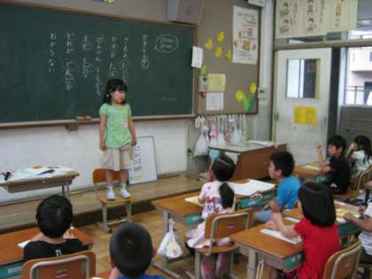 国語『かきとかぎ』の学習の様子です。濁点がたくさん出てくる短い詩です。濁点の発音に気を付けながら,大きな声で読むことができました。詩のリズムが楽しく,覚えやすいです。すぐに覚えて,皆の前で発表する子どもたちもいました。