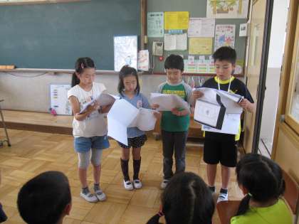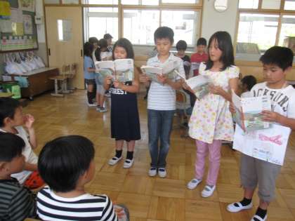 白いぼうしの学習で音読の学習をしました。また,登場人物の松井さんが出てくるシリーズ本を読み,それぞれが選んだ本の音読発表をしました。2年生には,去年学習した「きつつきの商売」でも音読発表をしています。さらに上手になった音読を披露できたようで,みんな終わった後はとても満足げな顔をしていました。