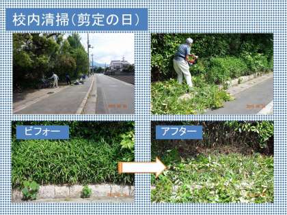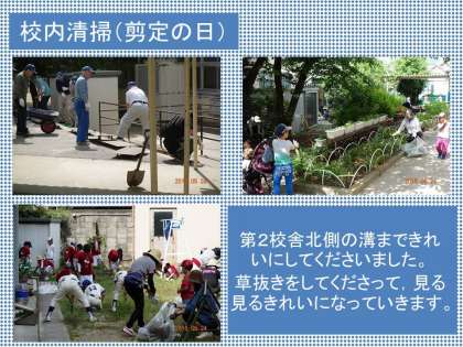 溝もきれいに掃除をしていただいたので,大雨が降っても大丈夫!。運動場周辺の溝は,砂が流れ込んで,すぐに洪水状態になります。正門は,学校の顔。正門付近の草抜きなどもきれいにしていただきました。正門あたりが,ずいぶん美人になったように思います。