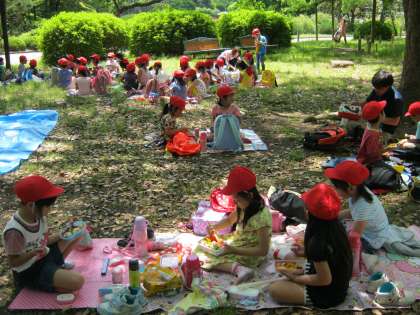 みんな楽しみお昼ご飯!お友達と集まって仲良く食べていました。自然の中で食べるお弁当は格別ですね。