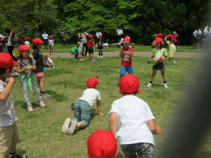 お昼ごはんの後は広場で思い切り体を動かして遊びました。鬼ごっこをしている子どもたちや草の上でごろごろしている子どもたちも…。たくさん遊ぶことができました。