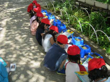 子どもたちが一生懸命育てているアサガオから双葉がでました。大きな双葉がたくさん出ていて,子どもたちは大喜びです。朝登校してからすぐに「アサガオにお水あげな!」と急いで出ていくくらい大事に育てています。生活の時間に観察をして見つけたよカードに双葉の絵をかきました。
