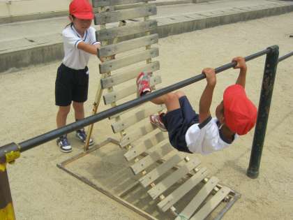 来週からプール学習が始まりますが、暑い中、鉄棒をがんばっています。さか上がりのできない子は、お友達に手伝ってもらってさか上がりに挑戦しています。