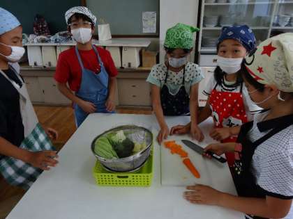 にんじんは,半月に切ります。ブロッコリーは…。ひとふさに,切る?ちぎる?