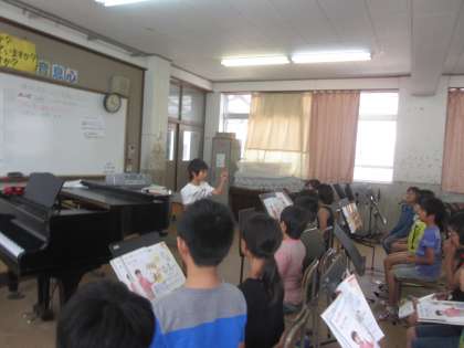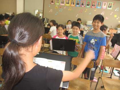 まずはグループで指揮者と歌係りにわかれて練習をしました。入るタイミングが難しそうです。そんなときはアドバイスを出し合ってます。そのあと、全体の前で指揮をした子もいます。
