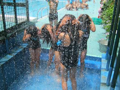 シャワーの水が冷たかったため、思わず「きゃあきゃあ」と大きな歓声がでました。