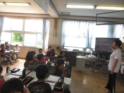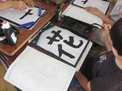 15日の習字の時間には、「花」という字を書きました。プールの横にはちょうど、アジサイの花が咲きほこっています。「花」という字の6画目は要注意。先生から書くときのポイントの説明を聞いてから、1画1画ていねいに描き始めました。お手本をよく見てかけていますね。