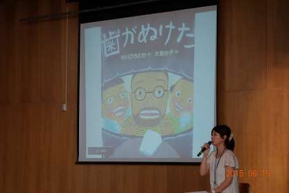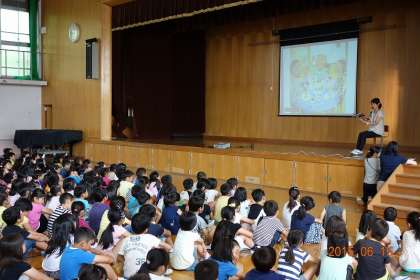 全校児童が体育館に集合。2年生担任のM先生が,おもむろに読み聞かせを始めました。全校児童が,絵本を映しだしたスクリーンにくぎ付け。