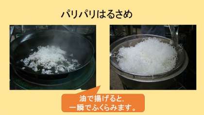 はるさめはそのまま油で揚げました。はるさめは油に入れると一瞬で大きくふくらみます。その様子を子どもたちにビデオで見せました。
