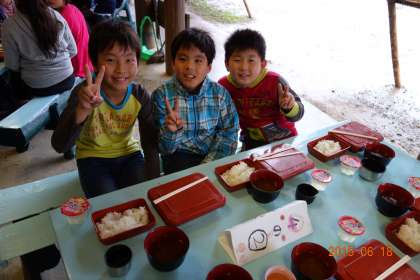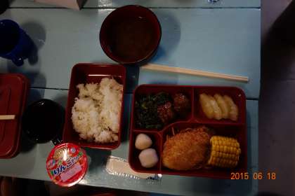 今日のメニューは、こんな感じです。なかなか合唱の声が上がらないので、ちょっと弁当のふたをあけて、中身を見せてもらいました。待っている間も、なぜか楽しそうですね。