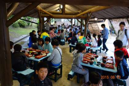 子どもの数が多いと、夕食の準備も一苦労。教職員も子どもたちもフル回転で働きました。この人数の割に、子どもたちのテキパキした動作のおかげで、25分ほどで完了。子どもたちよく働きますねー。こんなに手際よく、テキパキと作業する4年生は、初めてです。(ちょっと、褒めすぎたかもしれません)