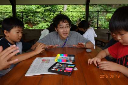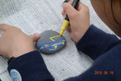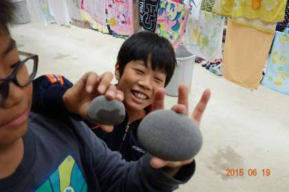 やる気満々の子どもたち。こんな石に絵を描いていきます。どんな絵になるのか、楽しみですね。この石を手に入れるために、昨日は強風強雨の中を、大野浜というところまで行ったのです。強風のあまり、先生の傘は折れてしまったのです。でも、心は折れていません。大丈夫です。