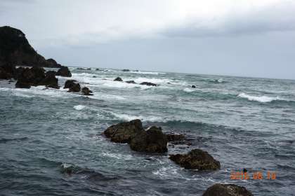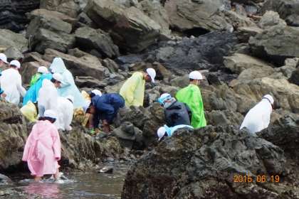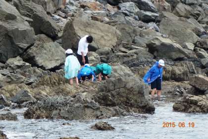 波があるので、あまり海には入れませんが、K先生を隊長とする探検隊が、崖沿いにちょっと冒険。