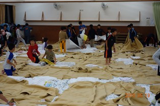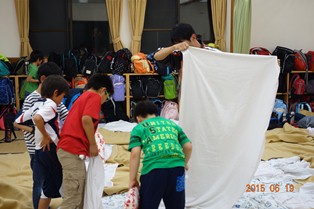 あちこちで、茶色の毛布の上を懸命に這いずり回りながら寝具の用意をしている男子たち。女子に比べると、明らかにオタオタ感がでていて、なかなか面白い光景でした。