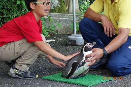 ペンギンは,可愛いですね。知らなかったのですが,本来ペンギンは人には慣れないそうで,近づくと威嚇をするそうです。このペンギンは,ウーちゃん(本当は,クックちゃんかと思っていたのですが,職員室で聞くとウーちゃんでした)は,卵を人工孵化させて,人に育てられたので,おとなしいのだそうです。野生では,すごく気が荒いとのこと。見かけとは大違い。ひげをはやして,オールバックの人でも,実はとっても優しいということもあるのです。