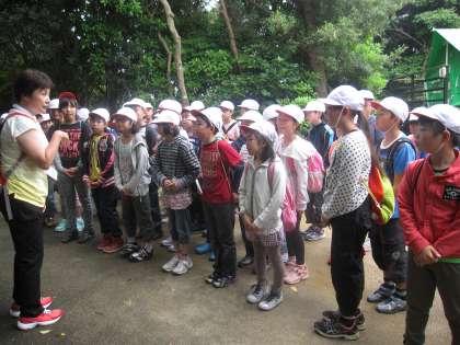 D先生から途中に,「ここで走って,骨折する人がたくさんいます。」という話を聞いて,子どもたちの顔が引き締まりました。野外炊事場まであと少し・・・