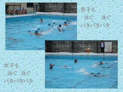 バタ足でうまく進む児童が,お手本として泳いでいます。うまいもんです。プールサイドから,大きな拍手。本人は少し照れていましたが,そこが奥ゆかしいところ。