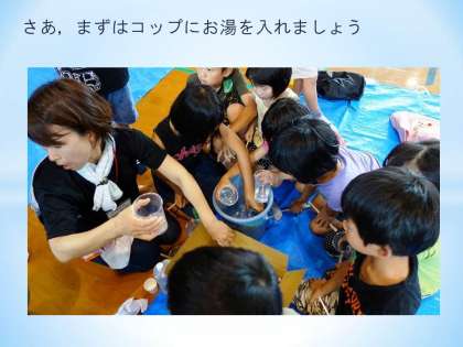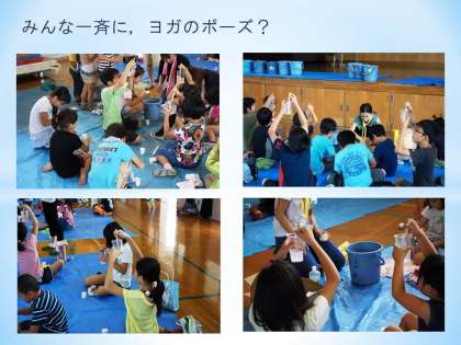 子どもたち,同じようなポーズをしています。ヨガのポーズではありません。塩が溶けたか,コップの底に残っていないかを確認しているのです。