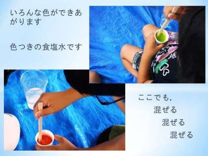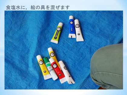 食塩水ができたら,絵の具を混ぜ込みます。色つきのボールになるんですねー。