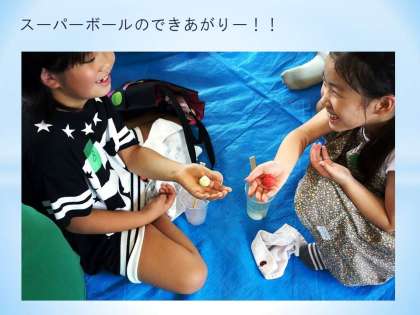 まだやわらかいですが,床に投げるとポヨーンと跳ね返ってきます。明日になれば,もっとかたくなって,スーパーボールの完全体ができるそうです。明日が楽しみ!!