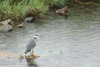川の中には,鴨やコサギなどがいます。水鳥かと思ってよく見ると,なんと鳩でした。鳩が水浴びしているのです。