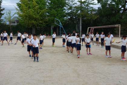 運動場では,陸上クラブが練習をしていました。4年生は,バトンの受け渡しの練習,高学年は学校の周りを走っています。