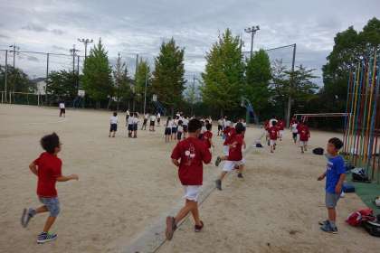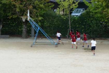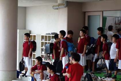 運動場には,陸上クラブとサッカークラブが練習中。運動場の周りを走っている赤のユニフォーム軍団は? そう,バスケットボールクラブの子どもたち。説明会で体育館が使えないので,体育館が使えるまでは,走っているのです。走り疲れて「まだ終わらへんのかなー」と体育館の入口の前に集まってきました。