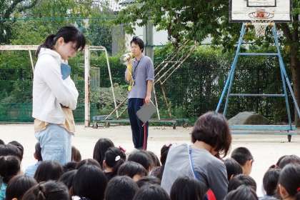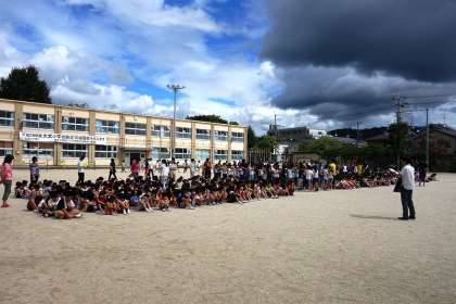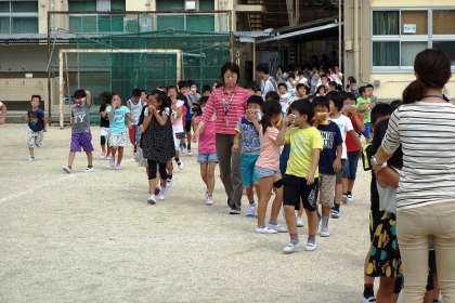 火事の放送から全員が運動場に避難を終えるまで,6分ちょうど。ふざけたりする子どもは一人もおらず,真剣な表情で訓練を終えることができました。