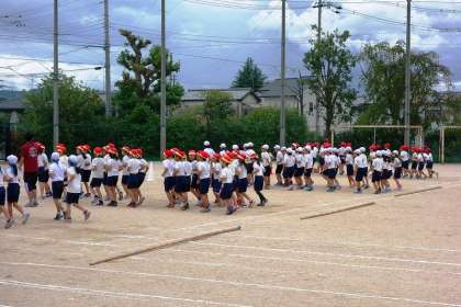 久しぶりに運動場が使えるので,3年生が団体競技の練習。太い竹竿が置いてあるので,何をするのかと思ってみていました。いよいよ入場です。