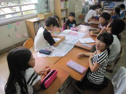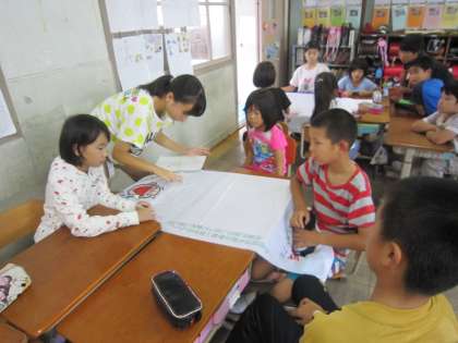 今日はたてわりグループで,旗づくりをしました。小グループのリーダーが考えてきてくれたものをもとに,旗にみんなで下がきをしました。どんな旗になるのか楽しみですね♪