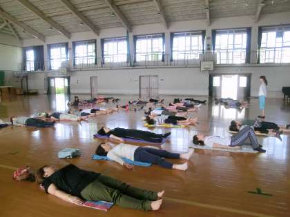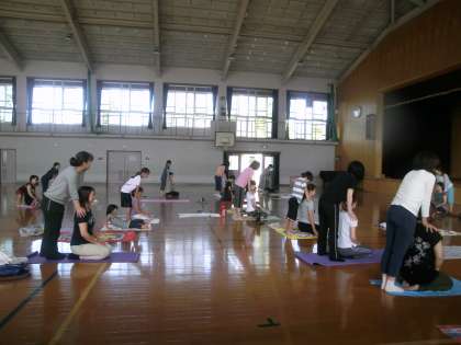 PTA保体委員さん主催のヨガ教室が行われました。子どもも大人もリラックス気分を味わっておられました。「気持ちいい?」と子どもに聞くと,にこっと「うん。}という返事が返ってきました。二人一組で腕を引っ張ったり,肩や首を伸ばしたり。寝方にも体にいい寝方があるようですよ。