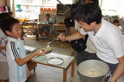 本野アナウンサーが,配膳に飛び入り参加。配膳の実況中継をサービス。