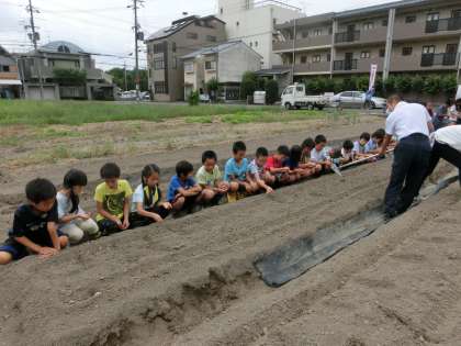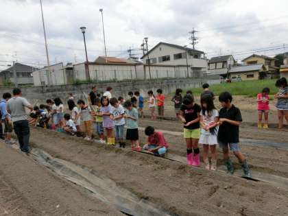 子どもたちは,畑の先生に教えてもらいながら1人2か所ずつ種まきをしました。