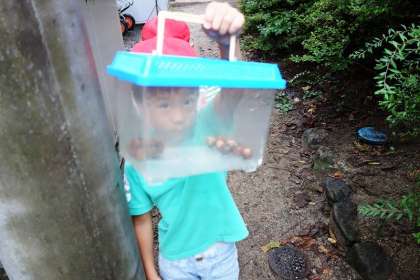 あちらにも,虫かごをもっている1年生。「虫かごに入っているの」と聞くと,「うん」と見せてくれました。虫かと思ったら,ドングリが入っていました。確かに,「虫かごには,虫しか入れてはいけない」というきまりはありません。