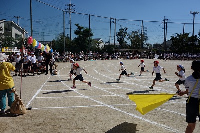 青空を背景に,一生懸命走っています。みんな最後まで力いっぱい走れました。
