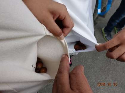 どんぐりがいっぱいあったと、両方のポケットにいっぱいどんぐりを詰め込んでいる、冬眠前のリスのような女子二人。